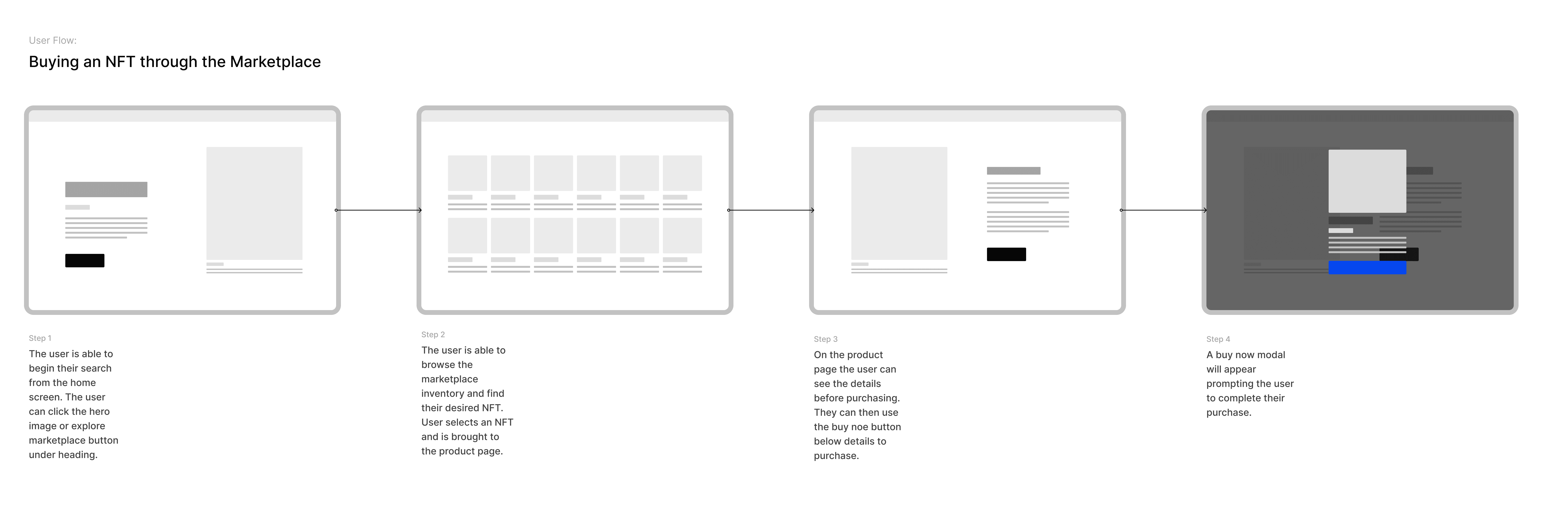 I created user flows to address the needs of each persona for the MVP version of the product. Some of our users would not have much experience using Blockchain products, so I spent some time outlining the first-time user flow with an emphasis on educating the users about the product. Since the buyer flow would be the first point of contact for first-time users, I prioritized it.