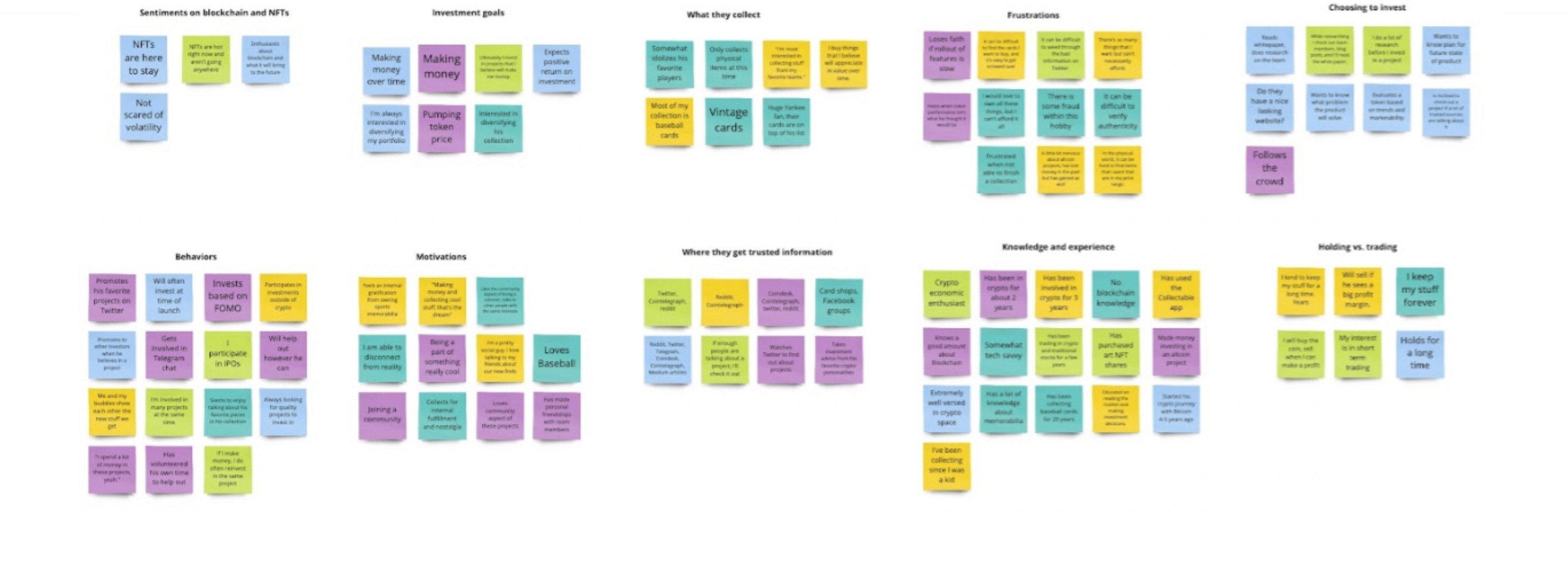 After screening participants with surveys, we had a group of five collectors and five alt-coin investors. Next up was to talk to these people and get to the heart of their motivations, goals, and frustrations when it comes to investing in crypto projects or collecting sports memorabilia. My lead designer crafted an interview guide for each group consisting of open-ended and non-leading questions. We conducted these interviews via Zoom and recorded them so we could reference back later.