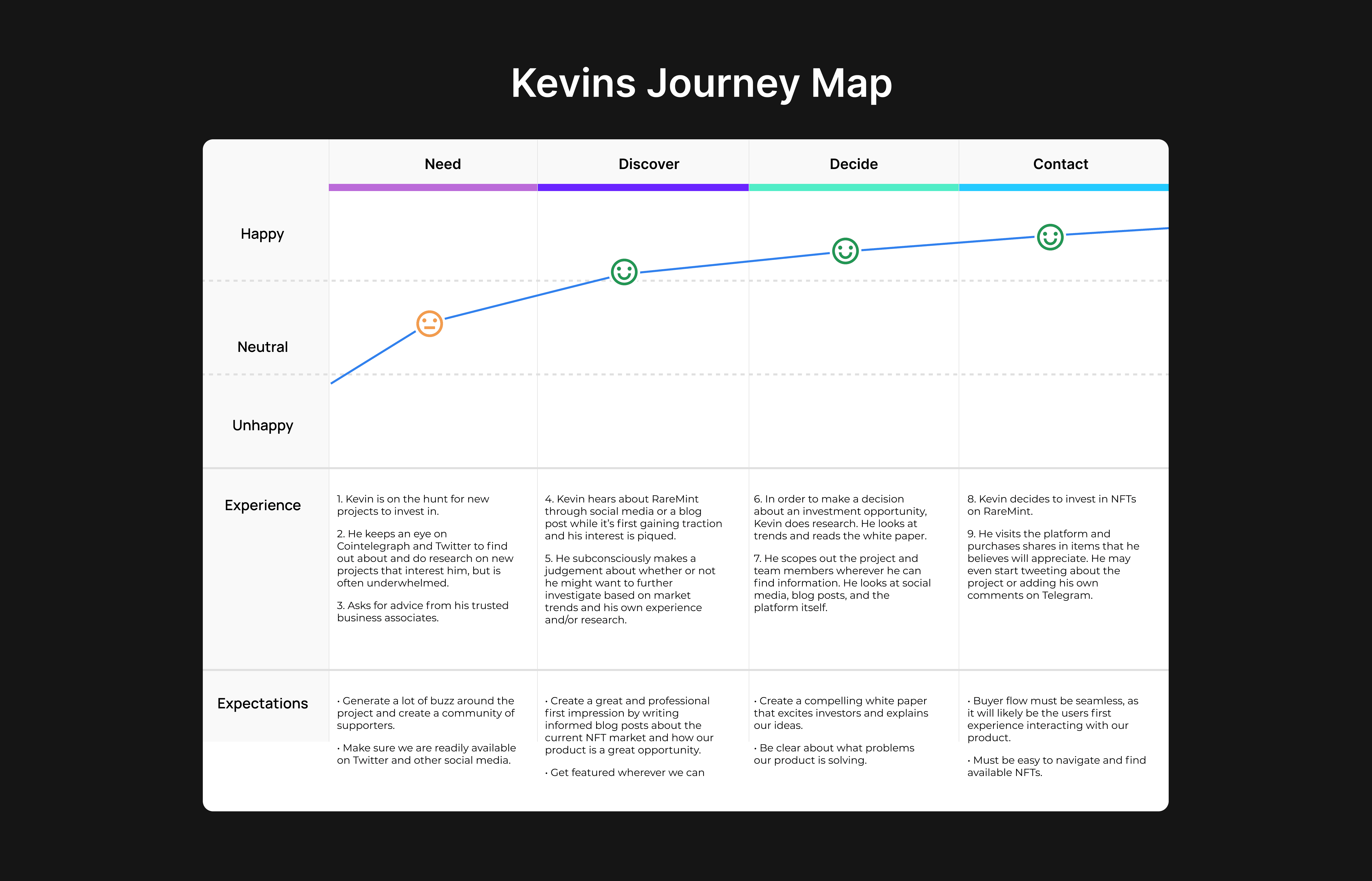 Our primary persona is Kevin the crypto investor. He makes informed decisions about what he invests in and has been doing this for quite some time. He doesn’t act on FOMO but rather acts on market trends and projections. He has previously made a solid amount of money in crypto and likely works in tech, finance, or similar industries. He is in his low to mid-30s. His goal is to make money over time with the motivation of living a comfortable or sometimes even luxurious lifestyle.